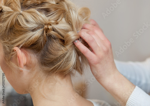 © Dimid, Naklejka premium Beautiful blonde girl with a beautiful, neat hairstyle, close-up in a beauty salon. Professional hair care and creating hairstyles.