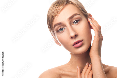 © Embrace of Beauty, Fototapeta premium Beautiful blonde hair girl with clean nude makeup isolated white background. Skin care concept