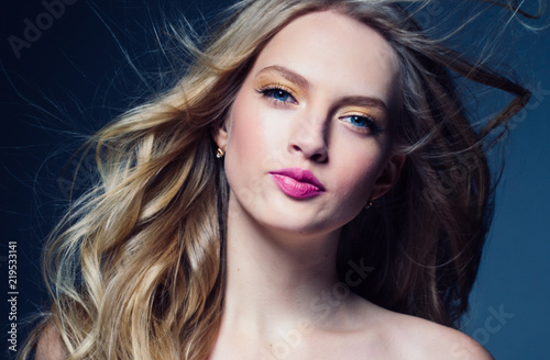 Obraz premium Beautiful blonde hair woman with beauty makeup pink lipstick