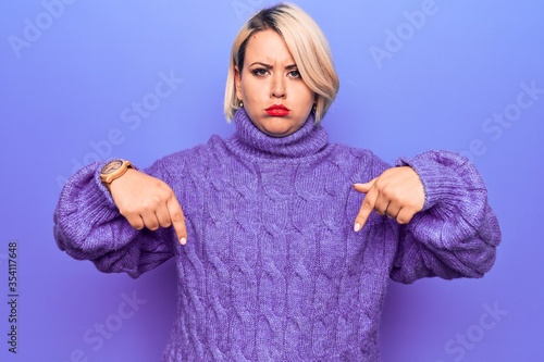 Obraz premium Beautiful blonde plus size woman wearing casual turtleneck sweater over purple background Pointing down looking sad and upset, indicating direction with fingers, unhappy and depressed.