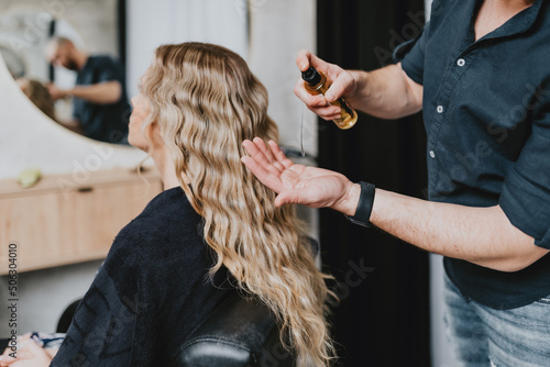 Fototapeta premium Beautiful blonde wavy hair of a young woman after a treatment in a hair salon.