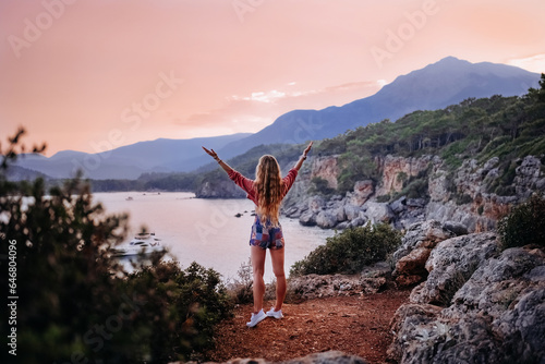 © Irina Magrelo, Obraz premium Beautiful blonde woman in casual clothes standing on the cliff near the sea