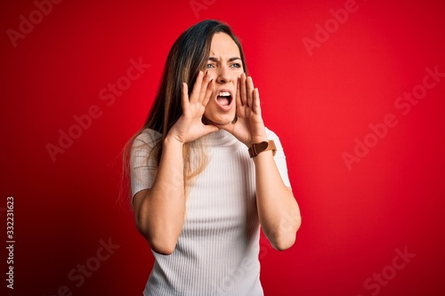 © Krakenimages.com, Fototapeta premium Beautiful blonde woman with blue eyes wearing casual white t-shirt over red background Shouting angry out loud with hands over mouth