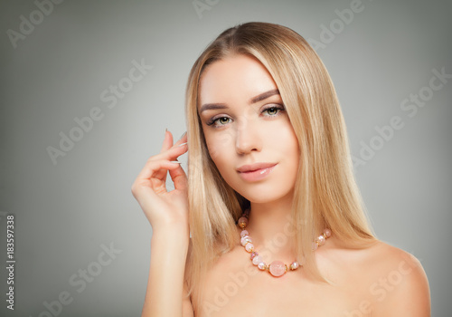 Fototapeta premium Beautiful Blonde Woman with Shiny Hair and Pink Necklaces