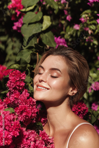 © blackday, Fototapeta premium Beautiful blonde woman with smooth skin and natural makeup, as she poses against a backdrop of a bush with delicate pink flowers