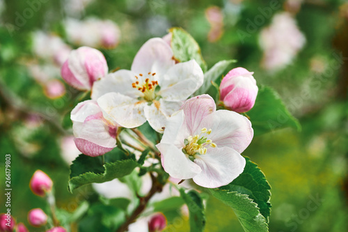 © bondvit, Obraz premium beautiful blooming apple trees orchard in spring garden close up