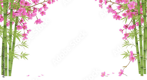 Naklejka premium Beautiful Blooming Cherry Blossoms and Bamboo Frame on White Background