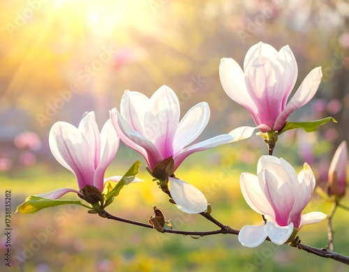 © Moni, Fototapeta premium Beautiful Blooming Magnolia Flowers Branch Under Sunlight, Spring Season Concept