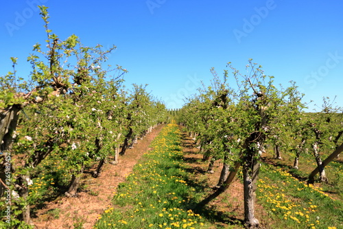 © Dynamoland, Naklejka premium Beautiful blooming of decorative white apple trees over bright blue sky