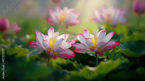 Fototapeta premium Beautiful blooming pink and white water lilies floating on a pond with lush green leaves and soft natural sunlight in a tranquil garden scene