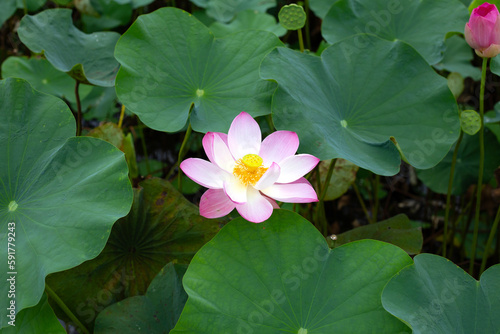 Fototapeta premium Beautiful blooming pink lotus flower with green leaves