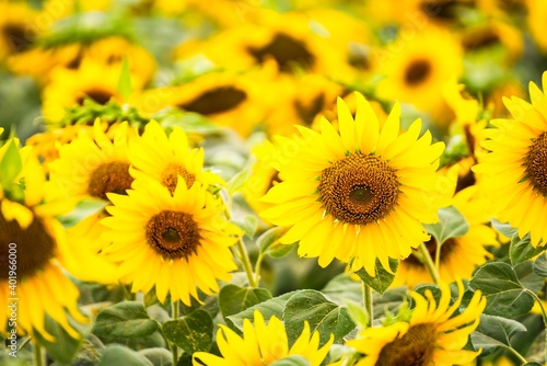 Fototapeta premium Beautiful blooming sunflower on a background field of sunflowers.Sunflowers have abundant health benefits. Sunflower oil improves skin health and promote cell regeneration.Selective focus