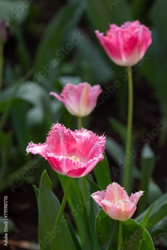 Fototapeta premium Beautiful blooming tulip. Close up. Garden decoration. Vertical shot.