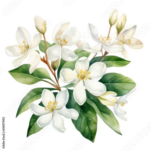 Fototapeta premium Beautiful Blooming White Jasmine Flower Bouquet Botanical Watercolor Painting Illustration