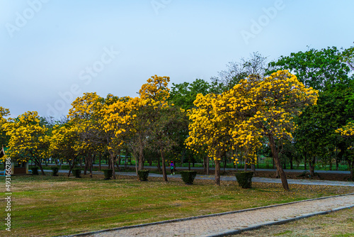 Naklejka premium Beautiful blooming Yellow Golden trumpet tree or Tabebuia aurea roadside of...