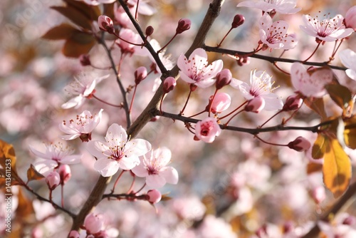 Obraz premium Beautiful blossoming cherry plum tree with pink flowers outdoors, closeup