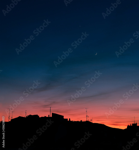 © Naikari Díaz, Obraz premium Beautiful blue and orange sunset with moon. Black cityscape.