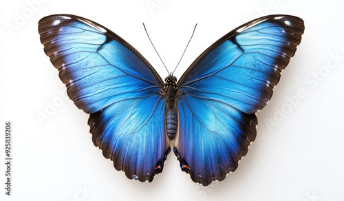 Fototapeta premium Beautiful blue Butterfly with open wings on a white minimalistic background,...