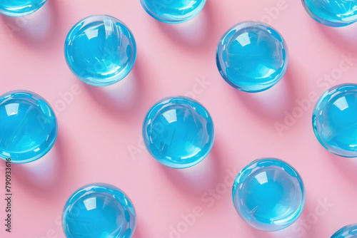 Fototapeta premium Beautiful Blue Glass Balls Arranged on Vibrant Pink Background with Blue Sky,...