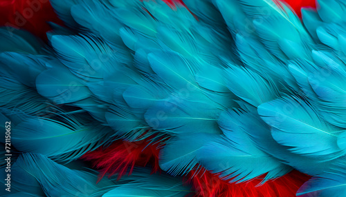 Fototapeta premium Beautiful blue green and red feathers as background. Close-up, Macro background, Feathers texture. Colorful Banner