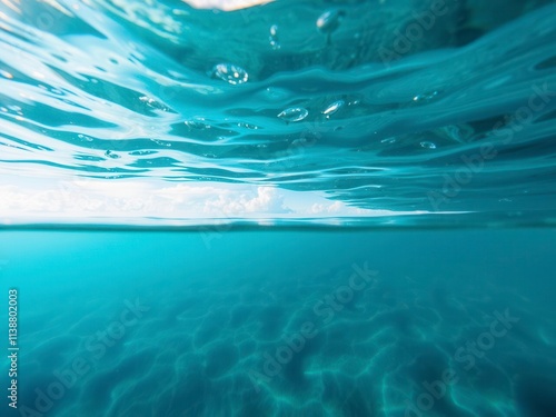 Fototapeta premium Beautiful blue ocean water surface with sunlight shining through the clouds, revealing the underwater world below, serene, tropical