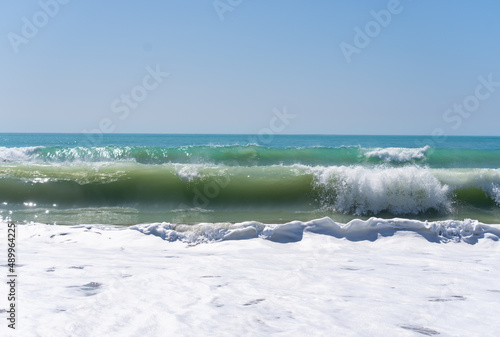 Fototapeta premium Beautiful blue sea and sky beyond white water from crashing and tumbling surf