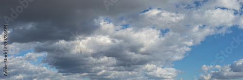Obraz premium Beautiful blue sky background panorama at daylight with white cumulus clouds. Backgroud banner
