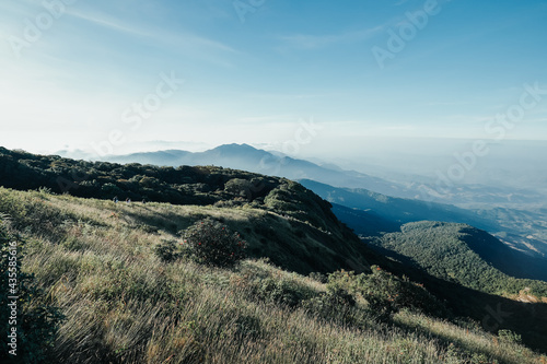 © Tony, Naklejka premium beautiful blue sky high peak mountains green forest guiding for backpacker camping backpacking hiking idea long weekend at Kew Mae Pan Nature Trail Waterfall Doi Inthanon, Chiang Mai, Thailand.