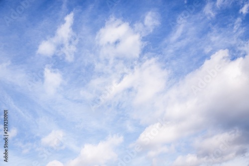 Naklejka premium Beautiful blue sky with cirrocumulus white clouds. Soft and gentle.