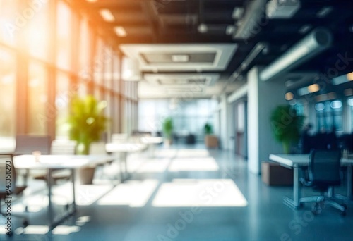 © Dzikrul Husnani, Fototapeta premium Beautiful blurred background of a light modern office interior with panoramic windows and beautiful lighting, ai