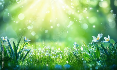 Obraz premium Beautiful blurred spring background with bokeh, green and blue colors,...