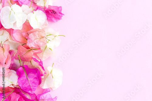 Fototapeta premium Beautiful bougainvillea on pink background.View from above. Background with copy space