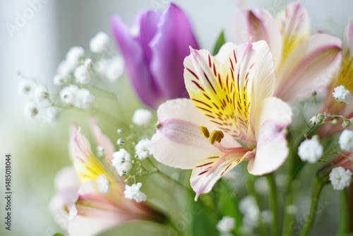 Fototapeta premium Beautiful bouquet of delicate flowers with soft colors in a bright setting