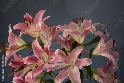 © Olga, Fototapeta premium Beautiful bouquet of flowers. Lilies on a dark background. Background. Texture.