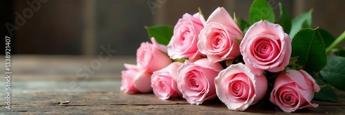 Fototapeta premium Beautiful bouquet of pink and white roses on a rustic wooden table, wooden...