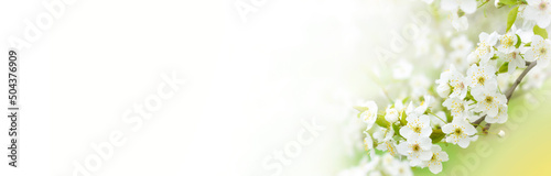 © syhin_stas, Obraz premium Beautiful branches of blossoming cherries. Beautiful abstract spring background. Banner. Copy space