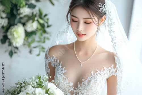 © Basileus, Naklejka premium Beautiful bride in a lace dress holding a white bouquet