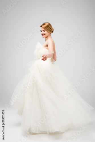 © LIGHTFIELD STUDIOS, Fototapeta premium beautiful bride in white wedding dress, isolated on grey
