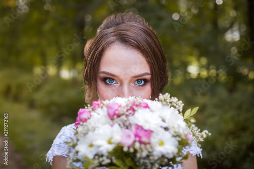 Fototapeta premium Beautiful bride with bridal bouquet. Portrait of a woman in white wedding...