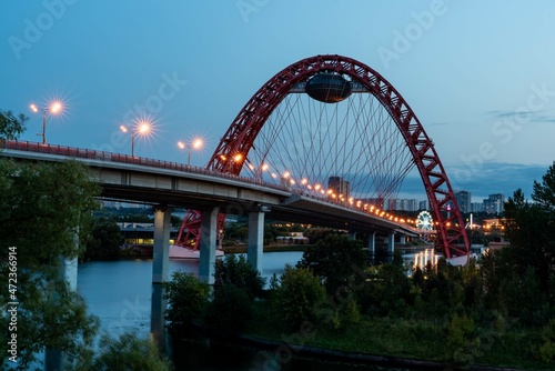 © kotopalych, Naklejka premium Beautiful bridge over the river in summer evening