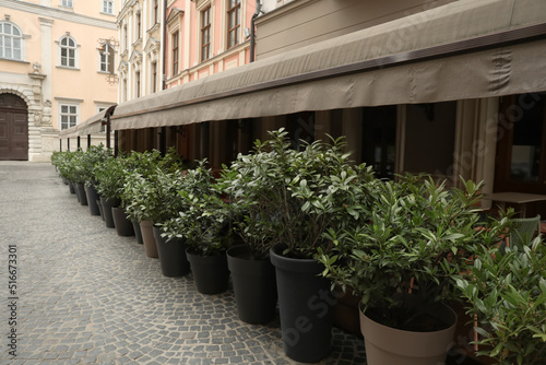 © New Africa, Naklejka premium Beautiful bright bushes in plant pots on city street