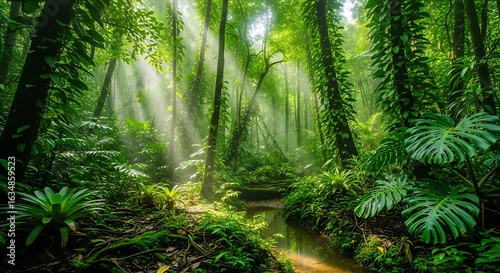 Fototapeta premium Beautiful bright landscape of a tropical rainforest with vibrant green plants and trees in sunlight.