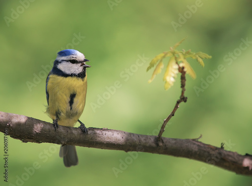 © nataba, Obraz premium beautiful bright little bird tit sitting on a branch in the Park in the spring and singing a song