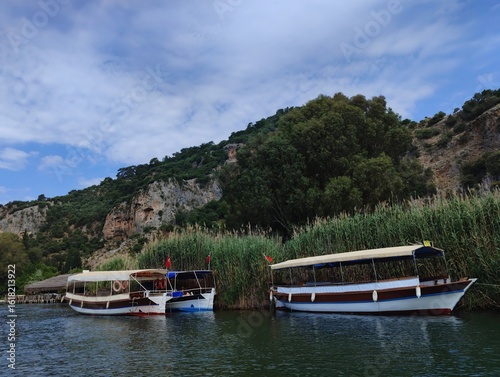Naklejka premium Beautiful bright nature photo image of marina yacht club boat in the sea with...