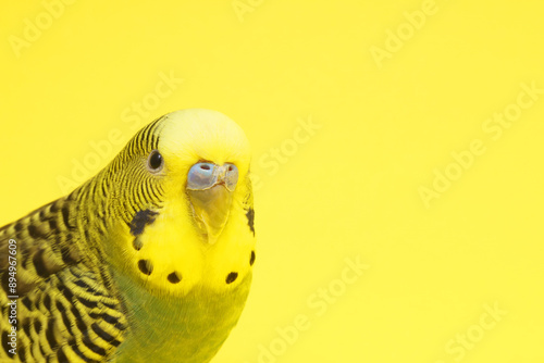 © New Africa, Fototapeta premium Beautiful bright parrot on yellow background. Exotic pet