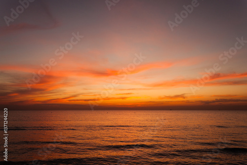 © dolphinartin, Naklejka premium Beautiful bright stunning romantic sunset or sunrise on the horizon of clouds and the turbulent Black Sea of ​​the Krasnodar Territory in the tourist village of Anapa.