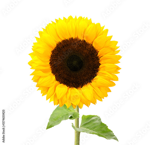 © New Africa, Obraz premium Beautiful bright sunflower with green leaves on white background