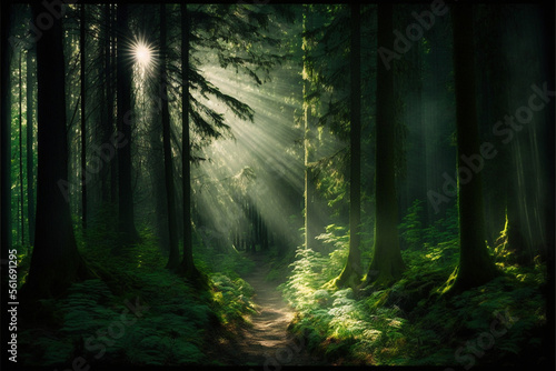 © Djomas, Fototapeta premium Beautiful bright sunlight throug the Forrest