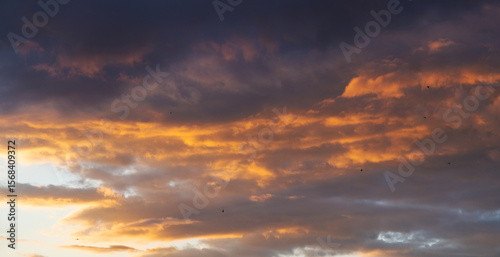 Fototapeta premium Beautiful bright sunset sky background with clouds. Evening time.