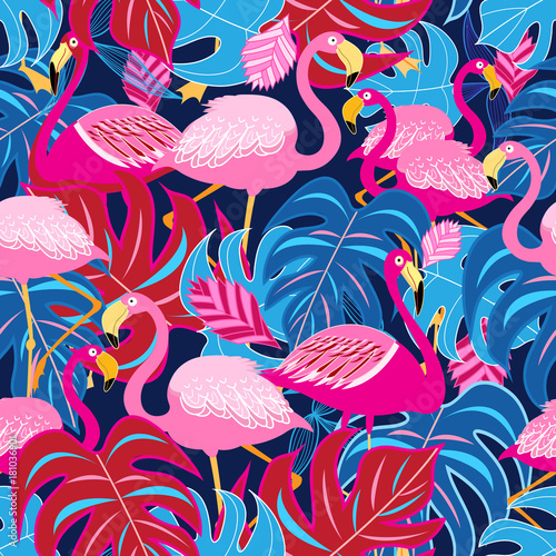 Obraz premium Beautiful bright tropical pattern of pink flamingos